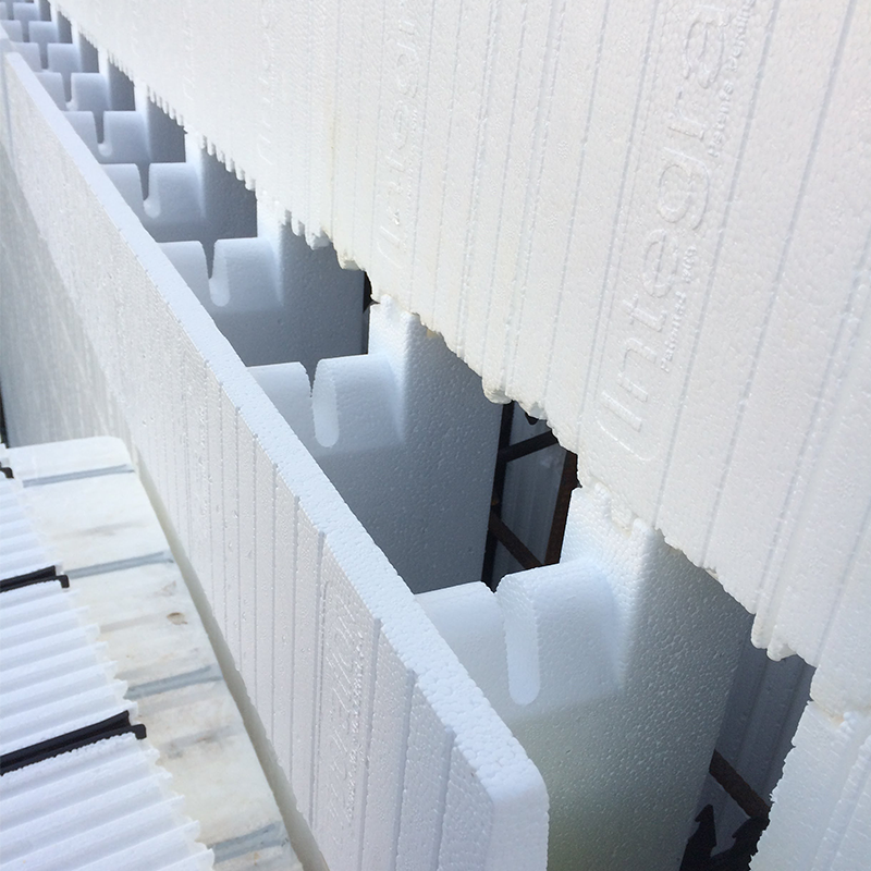 Lorsque le plancher est figuré pour recevoir un étage de coffrage isolant sur le prochain niveau, le plancher est installé à l’intérieur des murs de coffrage isolant et ne nécessite aucune isolation à l’uréthane. Il vous offre une conception monolithique sans aucun pont thermique et vous fait économiser grandement sur les poutrelles sur tout le périmètre du bâtiment.