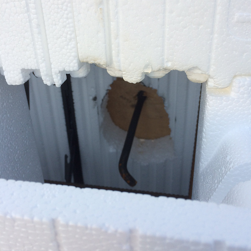 Faite une ouverture dans le Coffrage Isolant de +/- 4’’ centré dans le trou fait préalablement. Ne dépassez pas les lignes tracés du haut et du bas du morceau.