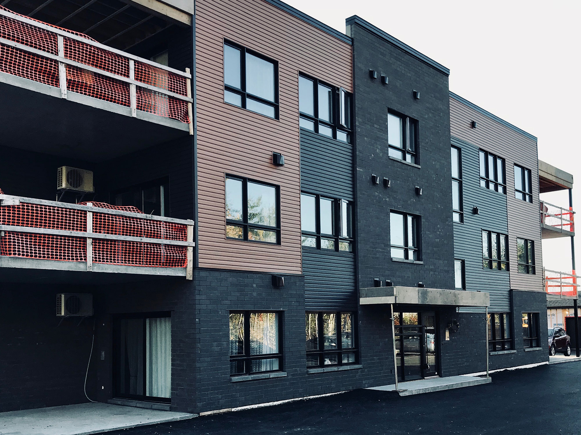 Dès que le 3e étage des murs en coffrage isolant a été complété, nous avons installé le toit du projet. S'en ai suivi par la suite, l'installation du revêtement extérieur en brique et parement de bois torrifié.