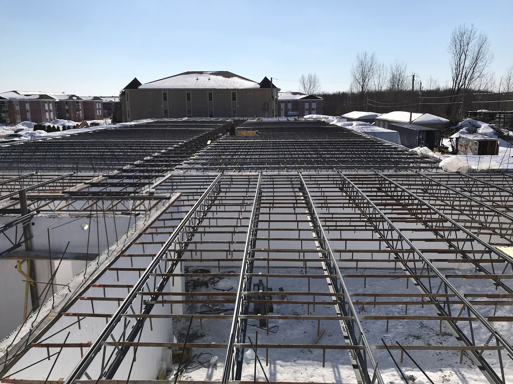 Une fois les murs du 1er étage coulé, nous avons installé un système de poutrelle Hambro pour les planchers du 2e étage. Le système a été un choix judicieux pour le promoteur.